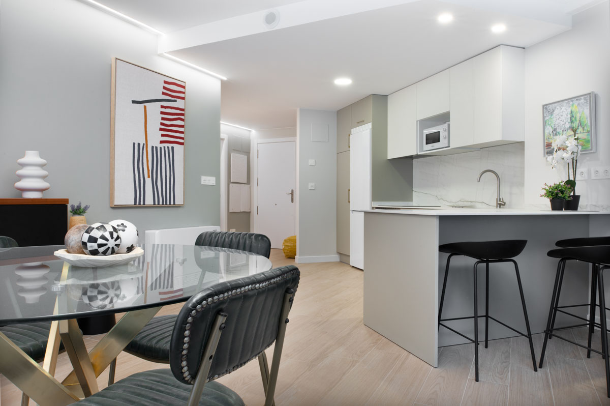 Frigorífico, lavavajillas, lavadora, cocina con horno y placa vitro cerámica, microondas, tostadora, plancha y TV.